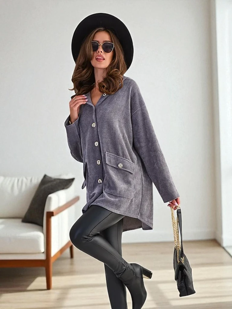 • Koma fram í stílnum þínum með þægilegri, þinni peysu sem sjávarhrokkar með fíngerðni og ágæti. Stórir, gullhnappar bæta við sérstakt eiginleika við hana. Módelinn á hettu og 2 vasapoka. Tengdu hana við uppáhalds buxurnar þínar!