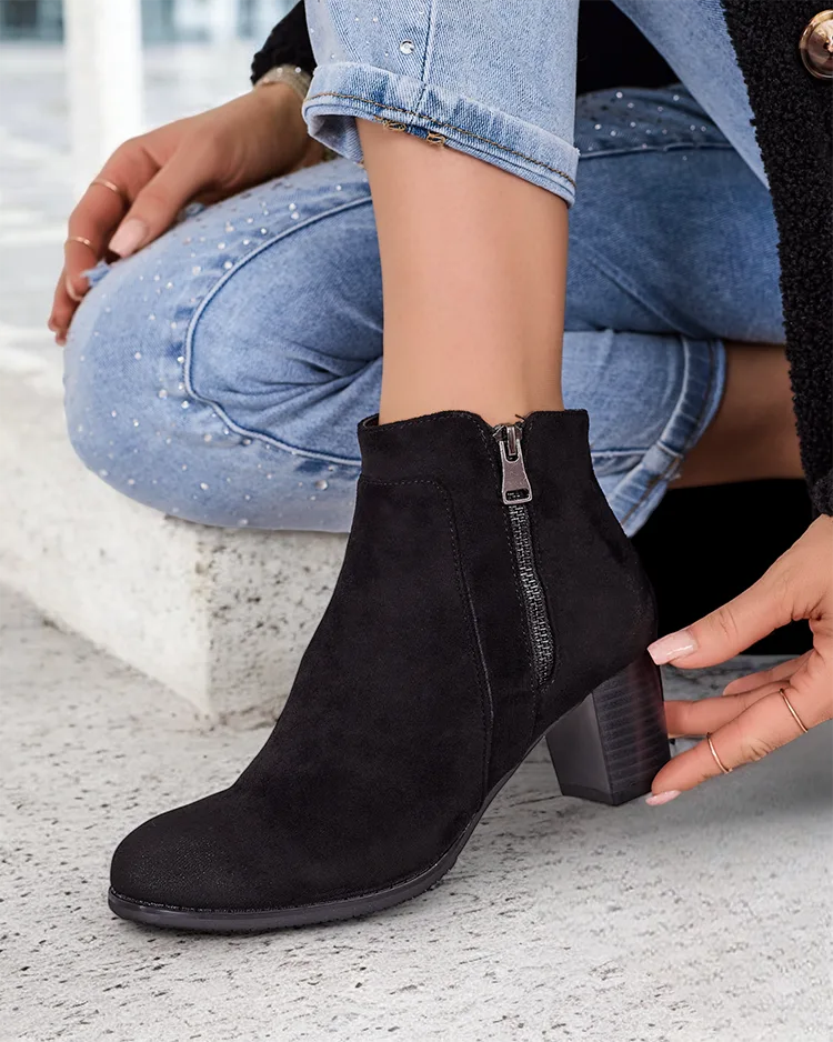 - Elegante støvler på en liten hæl er den perfekte kombinasjonen av eleganse og komfort. Modellen er laget av øko-suede skinn og har en myk fôr, noe som gir et stilig utseende for enhver anledning. Skoene har en dekorativ glidelås og slitasjer på skaftet.
