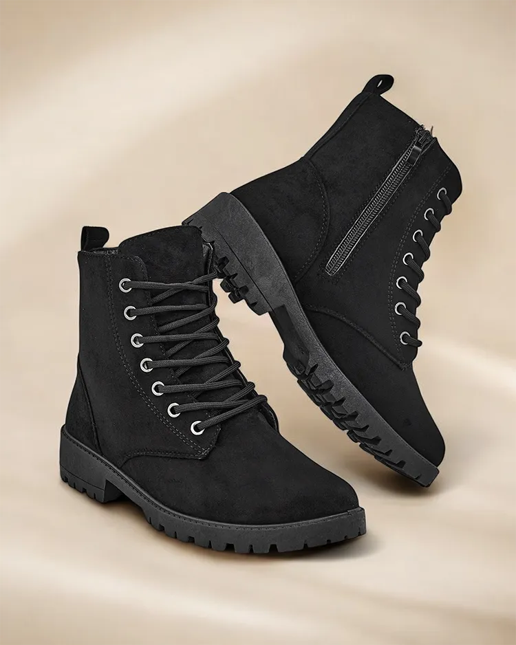 - Women's workers type ankle boots are a unique footwear combining style and comfort. Made of ecological suede leather and filled with soft fur. Laced and zippered model. Thicker sole adds comfort to the boots.