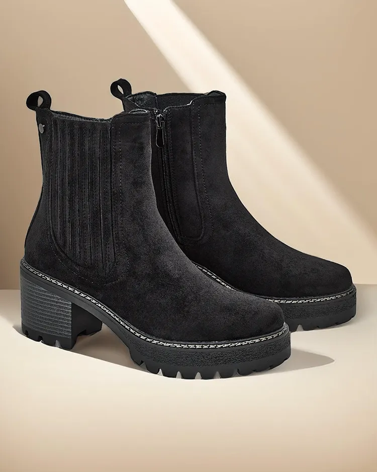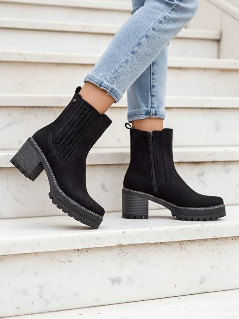 - Snygga kvinno stövlar är en perfekt lösning för kallare dagar. Eco-suede övre är fäst med en dragkedja, och inuti finns en pälsfodring. Modell på ett inlägg och med en rund tå. Ett utmärkt tillskott till dina avslappnade kläder!