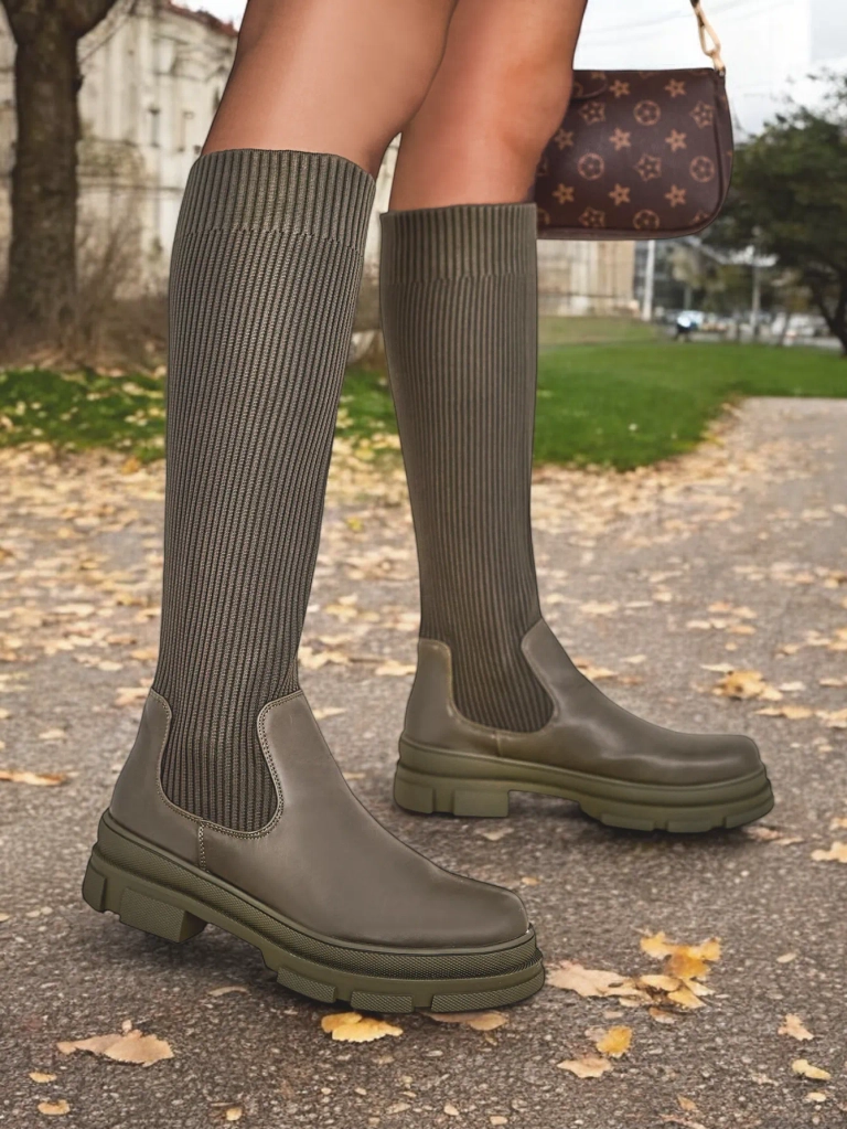 - Stiilsed naiste põlvekõrged kingad madalate kontsadega. Ülemine osa on valmistatud paindlikust kangamaterjalist, millel on eco-naha sisetükid, ning sees on kangas sisetald. Libisemismudel. Täiuslik igapäevaste sügiskomplektide jaoks!