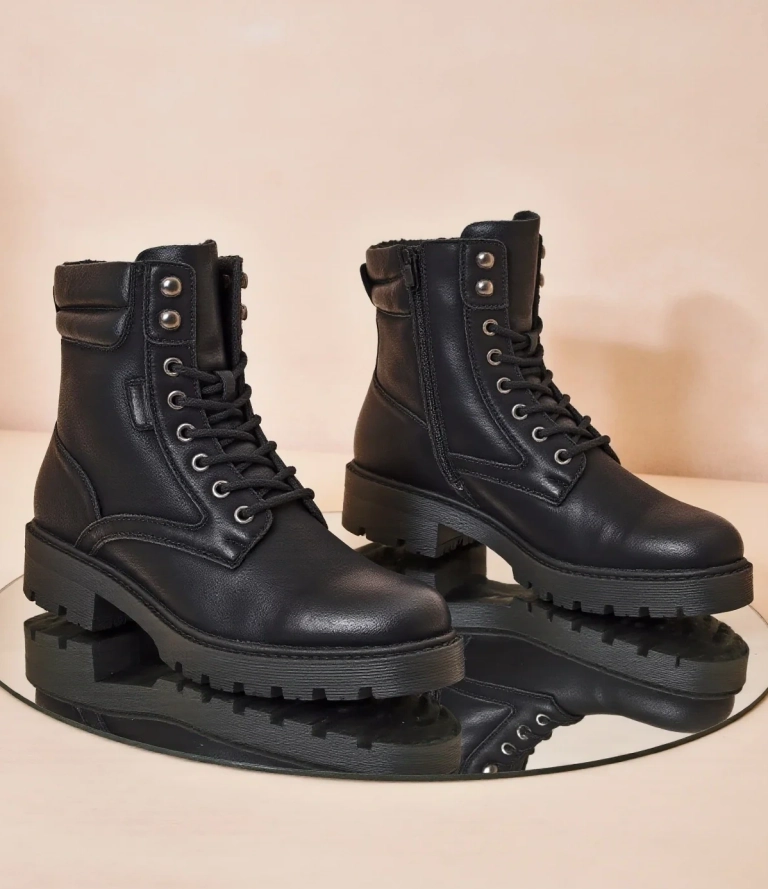 • Kvinnors arbetsstövlar är unika skor som kombinerar stil och komfort. Tillverkad av ekologiskt läder och fylld med mjuk päls. Spets-upp och dragkedjemodell.