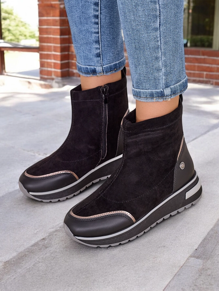 - Kvinnors plattform ankelstövlar, tillverkade av mocka eco läder. Stövlar fastsatta med en dragkedja, fodrad med bekväm päls inuti. Perfekt för hösten!