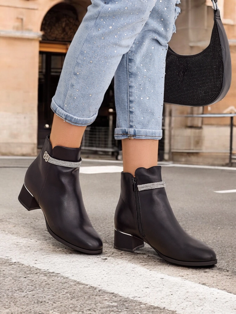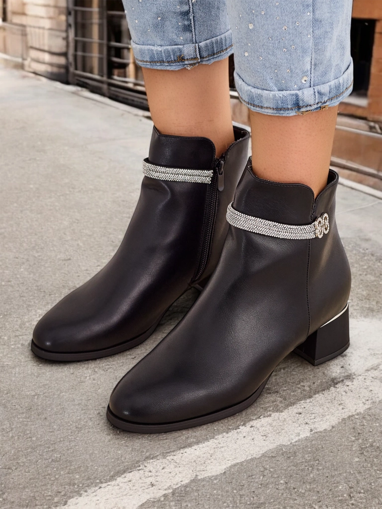 - Utmærkede kvinner's støvler med lave hæler, laget av patentøko-skinn. Innsiden er foret med delikat pels. Modellen er festet med glidelås. De har en dekorasjon med zirkoner. Perfekt for høst antrekk!