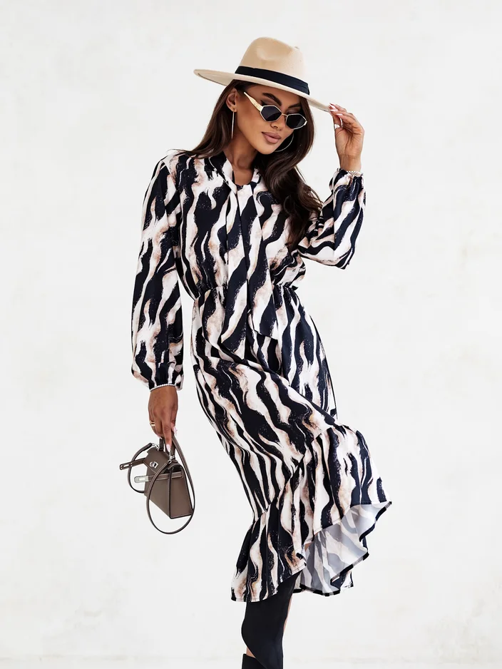 - Naiste midi kleit trükisega, pikkade varrukatega ja nöörivahega kaeluses. Mudelil on elastsus vööl ja voolav lõige. Täiuslik igapäevaseks kandmiseks! MÄRKUS: Mõõtmise täpsus (+/-) 1 cm.