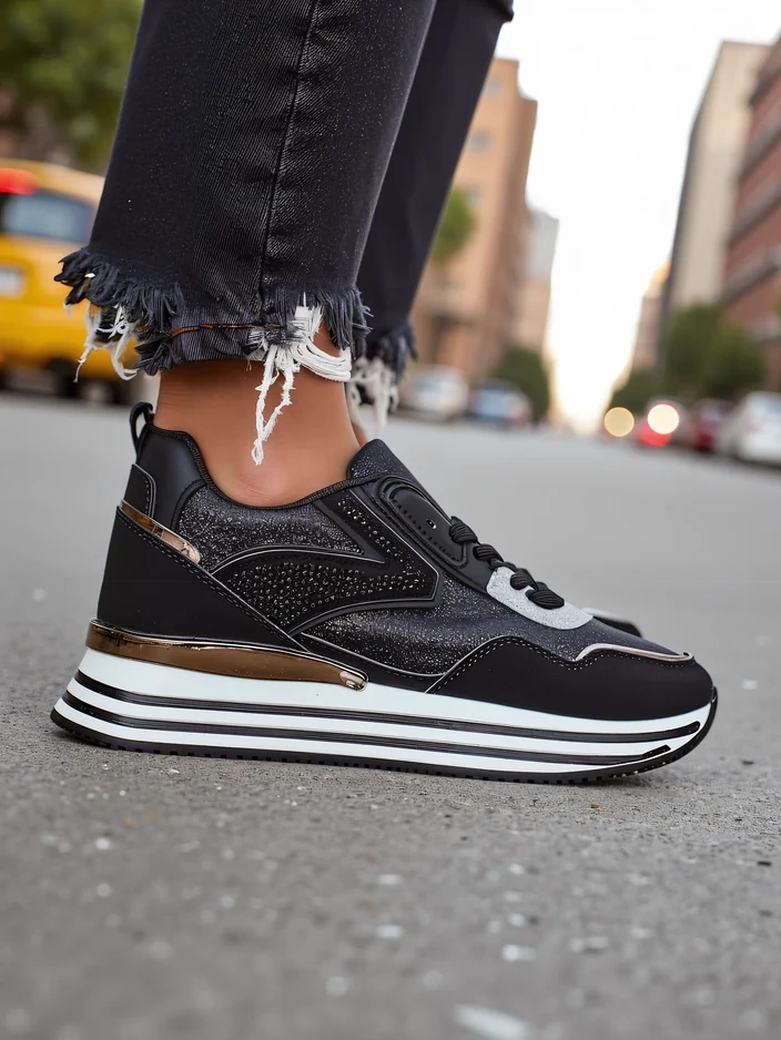 - Naisten urheilukengät tennistyyliin paksummalla pohjalla. Valmistettu ekonahasta ja glittermateriaalista, jonka sisällä on kangas. Loistava lisä arkipukeutumiseesi!