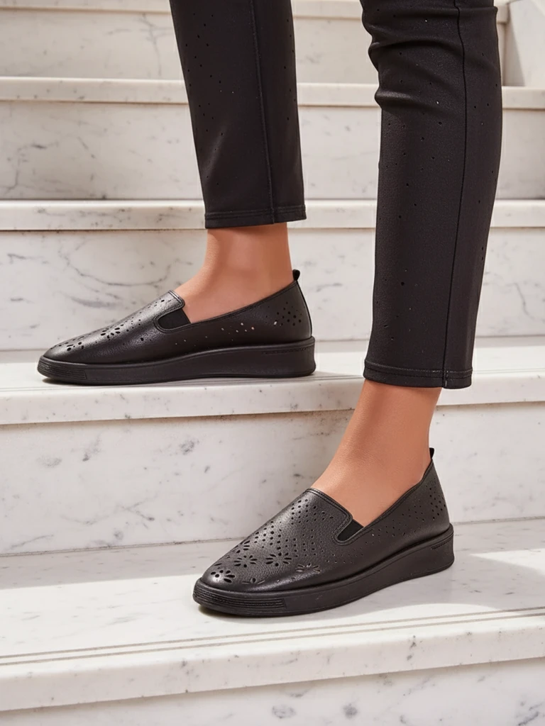 Sportlikud naiste mokassiinid madala tallaga. Klassikaline mudel, mis on valmistatud öko-nahast, ažuurse viimistluse ja tekstiilist sisetallaga. Ideaalne baas igapäevaseks kandmiseks!