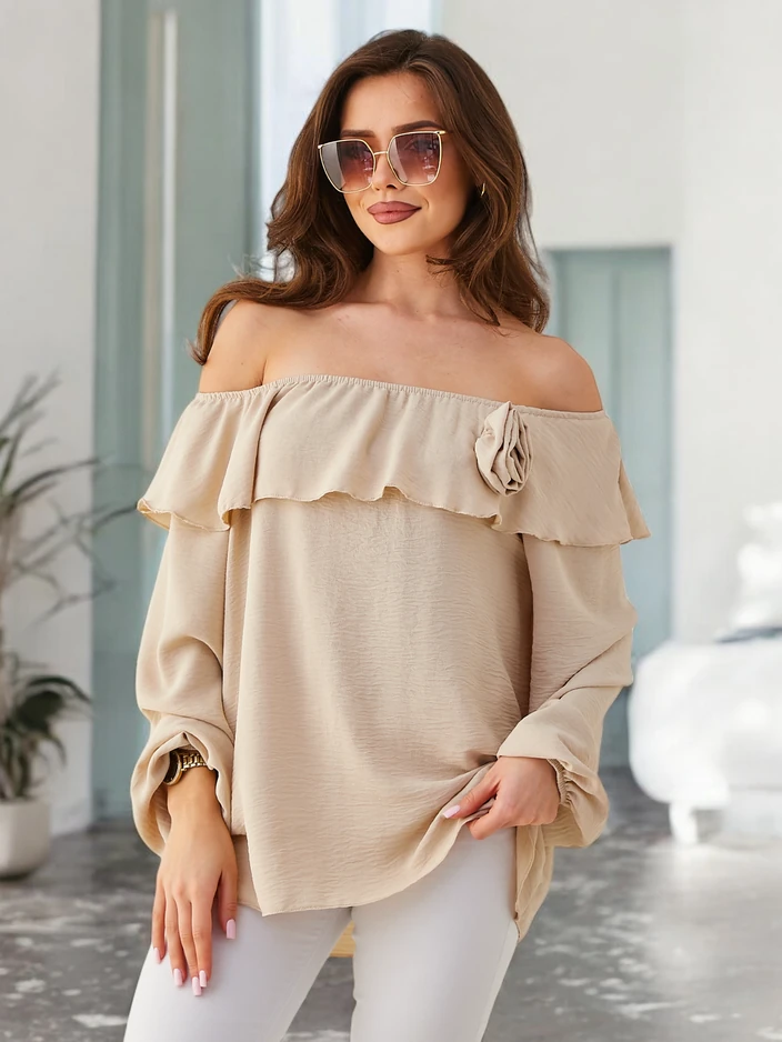 - Õlavarredelt avatud topp, millel on volang kaeluses, on elegantne ja naiselik valik igaks juhuks. Painduva kaeluse ja pikkade varrukatega sobib see ideaalselt siluetti, pakkudes mugavust ja liikumisvabadust. Diskreetne volang lisab kergust ja võlu!
