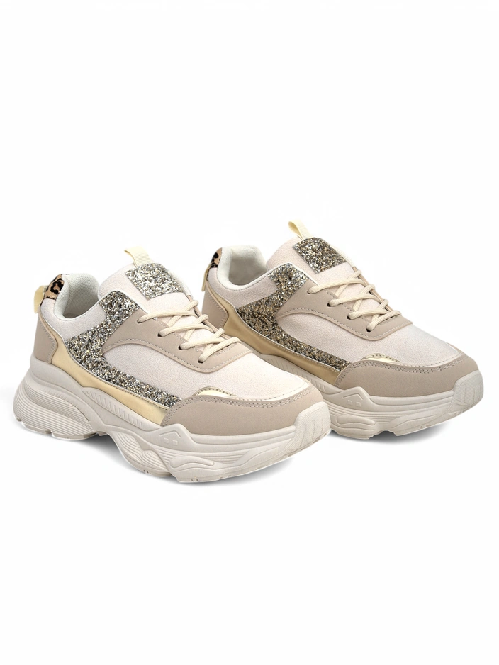 - Sportowe sneakersy damskie na płaskiej podeszwie, wykonane z eko skóry. Model posiada tkaninową wkładkę oraz grubszą podeszwę. Załóż je do szerokich spodni i koszuli!