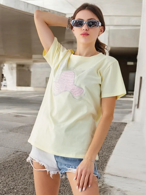 - Originaalne naiste pluus ümarate kraega, valmistatud pehmest ja meeldivast kangast. Kogu ese on kaunistatud silmapaistva trükiga ning lühikesed varrukad lisavad kerget. Täiuslik valik moekate ja stiilsete riietuste loomiseks!