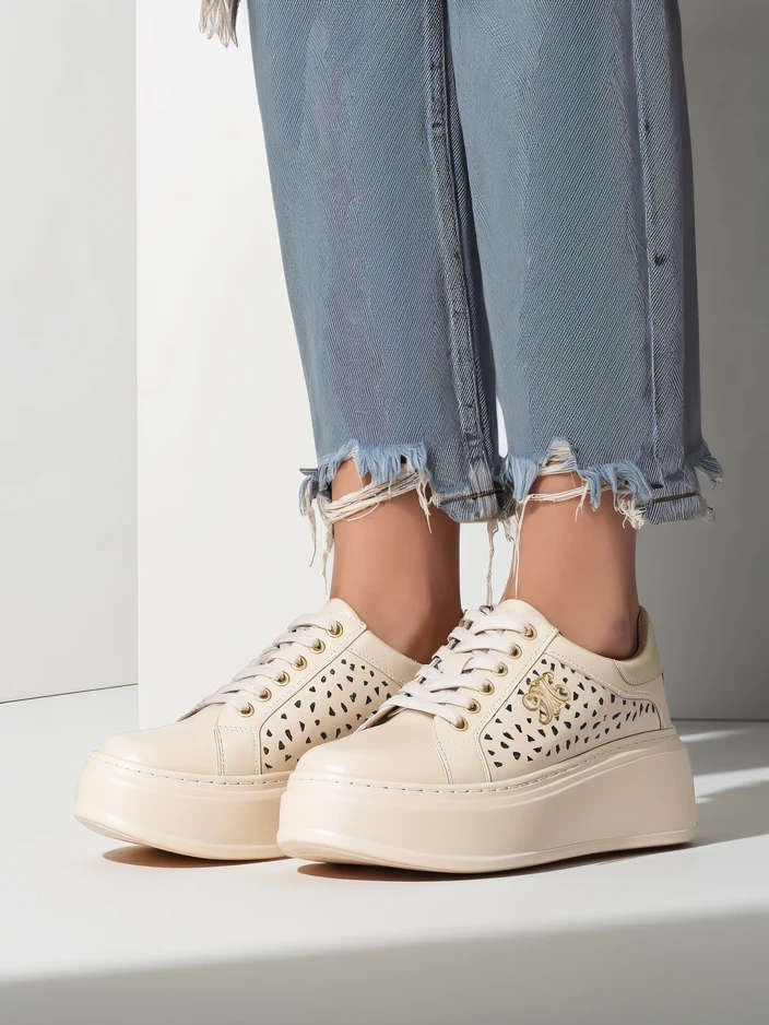 - Perforatsiooniga öko-nahast naiste platvormijalatsid - ideaalne kombinatsioon stiilist ja mugavusest. Kootud mudel, millel on looduslik nahk, tald. Ideaalne aktiivsetele inimestele!