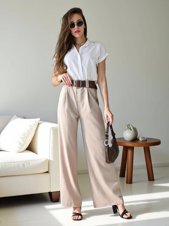 - Hämmastavad laiad püksid kerge kangaga, mudelil on 2 taskut ja elastne talje. Lisaks on kaasas vöö. Kohustuslik osa teie garderoobist! MÄRKUS: Mõõtmise täpsus (+/-) 1 cm.