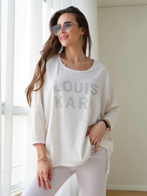 - Originaalne naiste pluus ümmarguse kaelusega, valmistatud pehmest ja meeldivast kangast. Kogu ese on kaunistatud õrna sädelevate kirjadega ning pika varruka lisab kergust. Suurepärane valik moodsate ja stiilsete riietuste loomiseks!