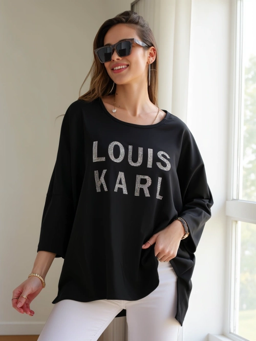 - Originaalne naiste pluus ümmarguse kaelusega, pehmest ja meeldivast katsuda materjalist. Kogu ese on kaunistatud delikaatse rhinestone-kirjaga ning pikad varrukad lisavad kergust. Täiuslik valik moekate ja stiilsete outfit'ide loomiseks!