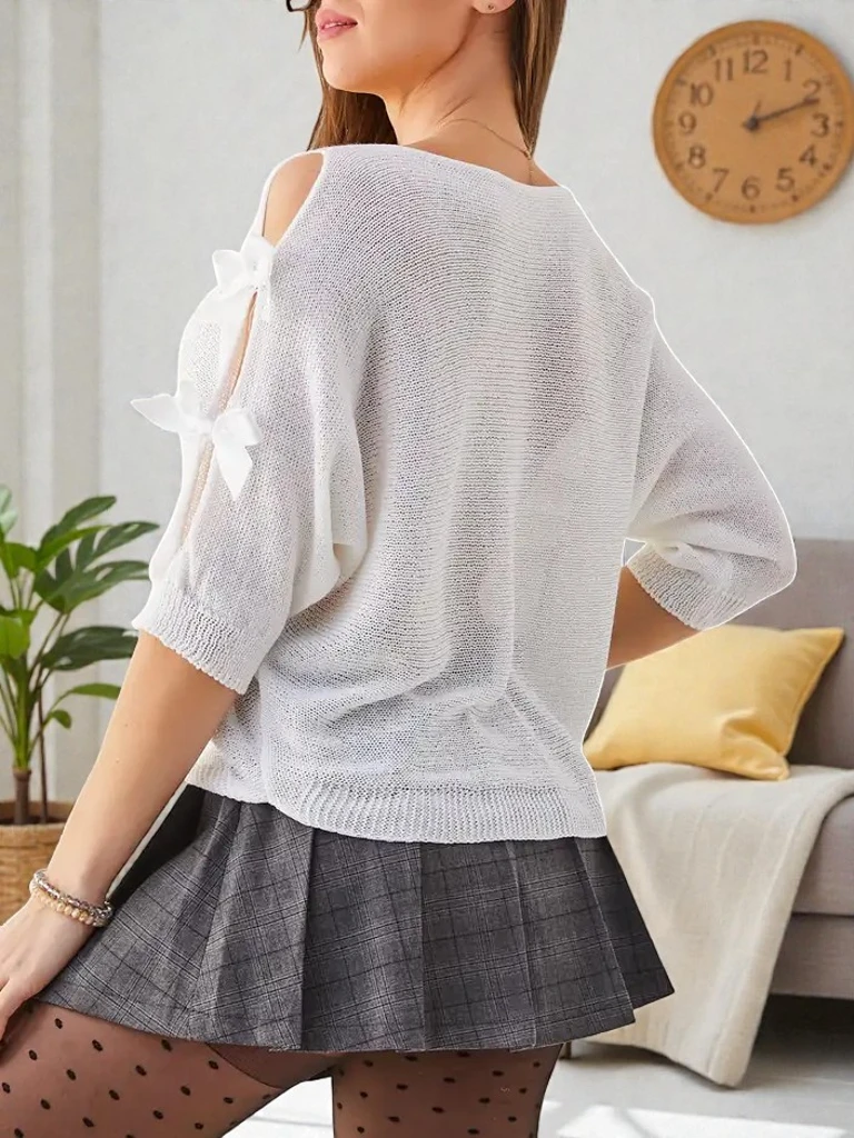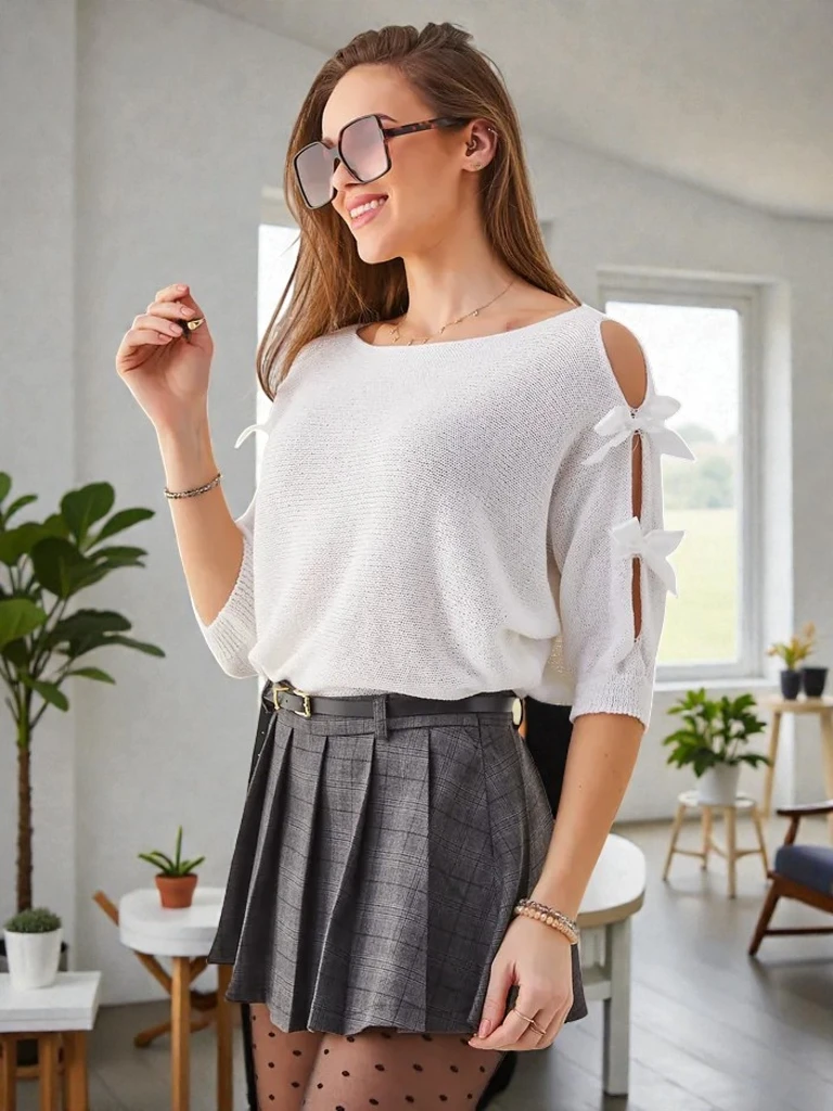 Zmysłowy damski sweter wykonany z miękkiej tkaniny, która zapewnia komfort noszenia. Model z okrągłym dekoltem oraz rękawami 3/4. Dodatkowo zdobiony kokardkami na rękawach, dodającym uroku i kobiecości.