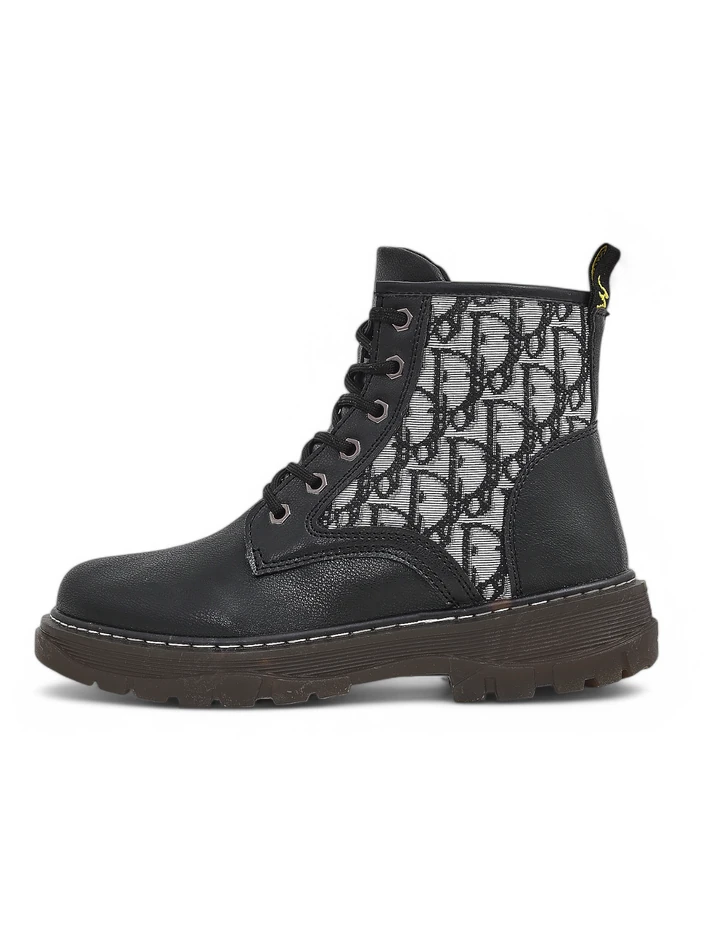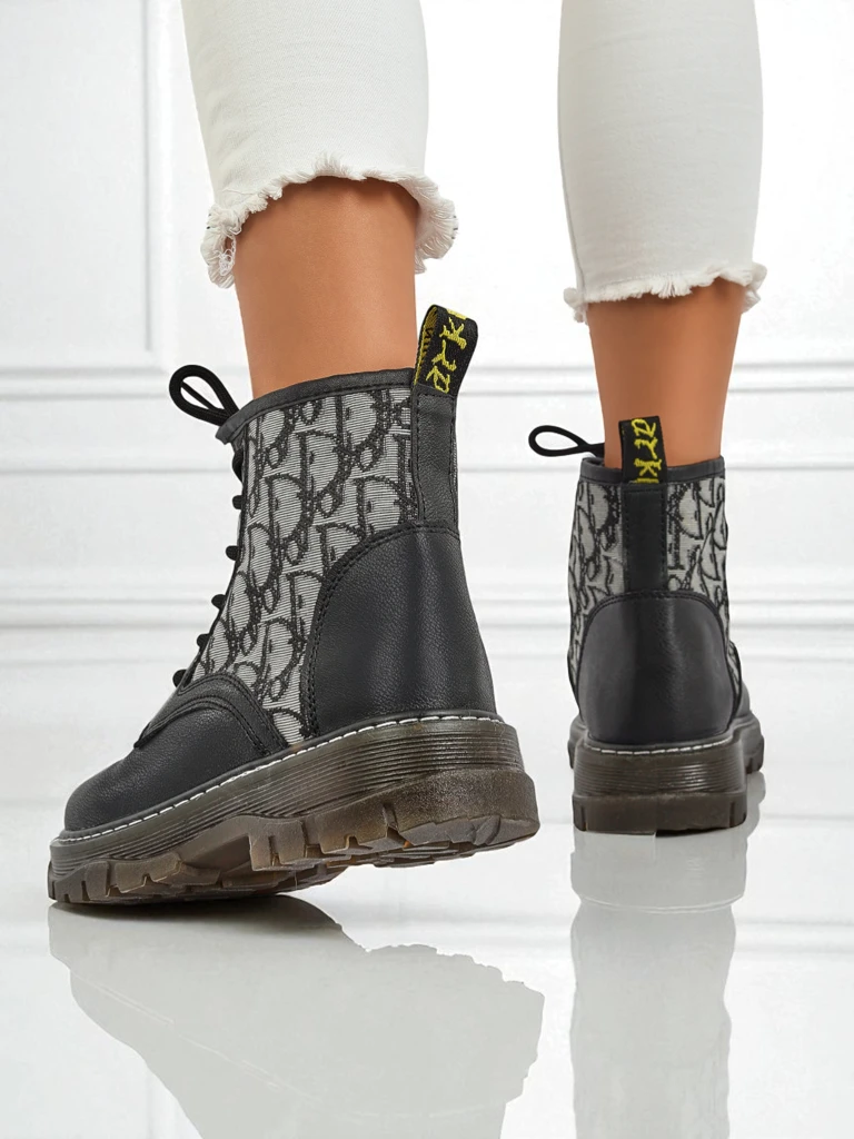 - Hämmastavad naiste ankle saapad lame kontsad, valmistatud eco-nahast ja mustriga kangast. Siseosa on kaetud kangaga. Kinnitatav mudel.