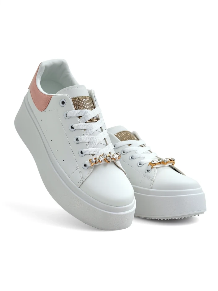 - Elegantne valge tossud, millel on sädelev metalldetail. Jalatsid on valmistatud ökoloost ja kangastruktuurist. Ideaalne vabaaja riietuse jaoks.