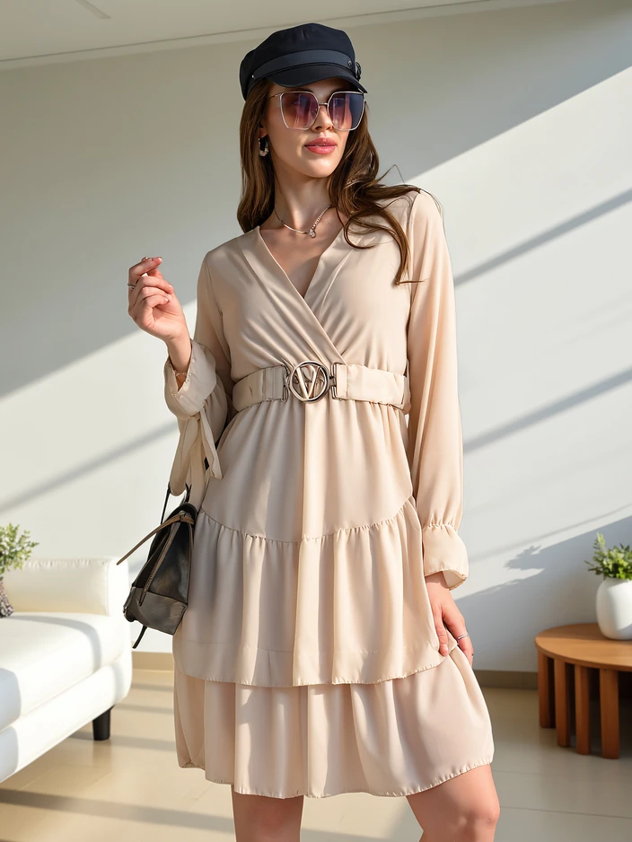 - Naiste mini kleit rüüdega. Mudel pikkade varrukatega, ümberpööratud kaelus, elastne vöökoht ja vööpühi. Hädavajalik teie garderoobis!