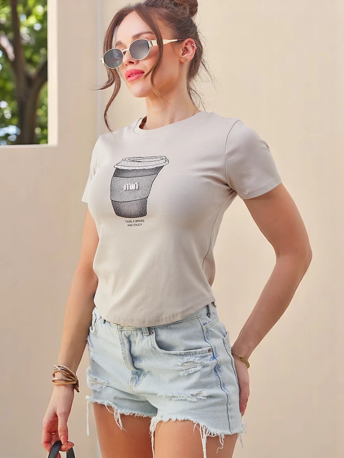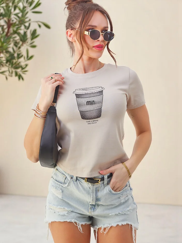 - Naiste puuvillane T-särk, millel on rhinestone'idega kaunistatud print, ühendades mugavuse peene säraga. Täiuslik igapäevaste riietuste jaoks, lisab see igale välimusele ainulaadset võlu.