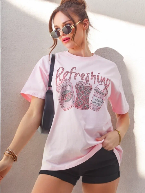 • Naiste puuvillane T-särk, millel on rhinestone'idega kaunistatud trükk, mis ühendab mugavuse õrnalt särava ilmega. Täiuslik igapäevaste stiilide jaoks, see lisab igale välimusele ainulaadset võlu.