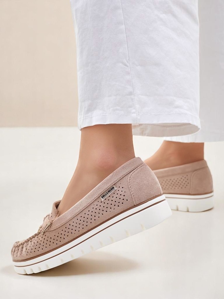 • Kerged naiste mokad tasase tallaga. Mudel on casual ja valmistatud ökoloogilisest seemisnahast, sisetald on valmistatud naturaalset nahast. Täiuslik kevadiste riietuste jaoks!.