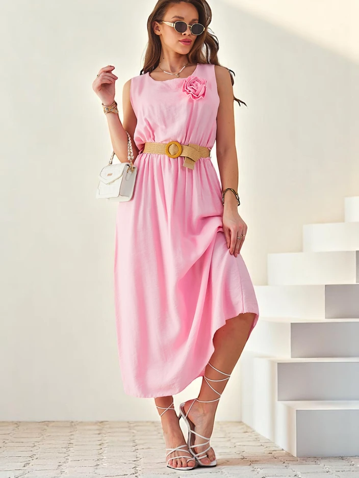 - Elegantne midi kleit rihmadega, ümmargune dekoltee ja lilledekoratsiooniga. Mudel rõhutab taljet tänu elastsele vöökohtale. Kerge, õhuline ja mugav – ideaalne suvepäevadeks ja õhtusteks väljasõitudeks.