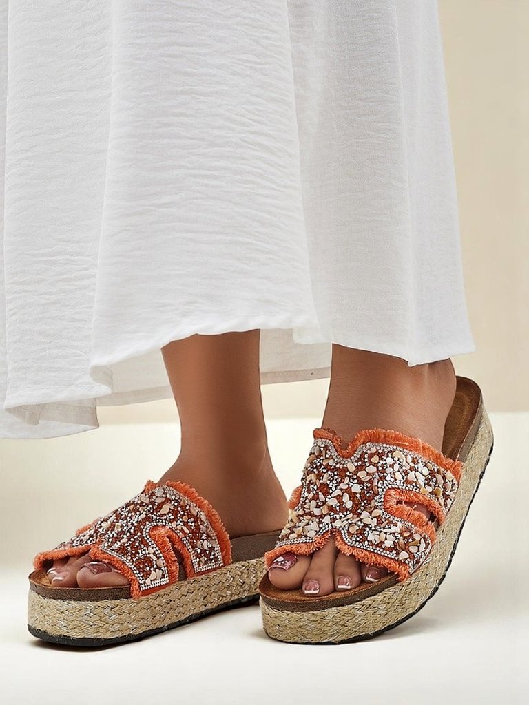 - Naiste sussid rannateemaliste kaunistustega, kangast, öko-seemisnahast sisetallaga ja paksema tallaga – stiil ja mugavus suveks.