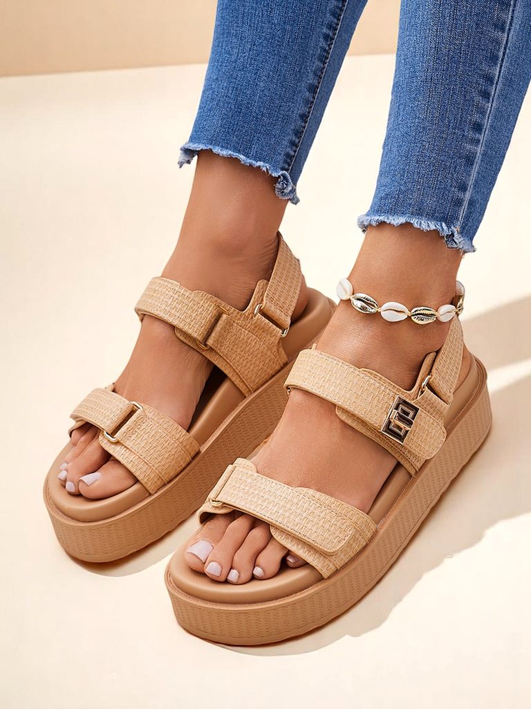Naiste sandaalid tasasel tallal on ideaalne valik kuumadeks suvepäevadeks. Rihmad on valmistatud meeldivast ökoloogilisest nahast. Esiosa on kaunistatud elegantsete, justkui punutud rihmadega. Jalanõud kinnitatakse takjapaelaga.