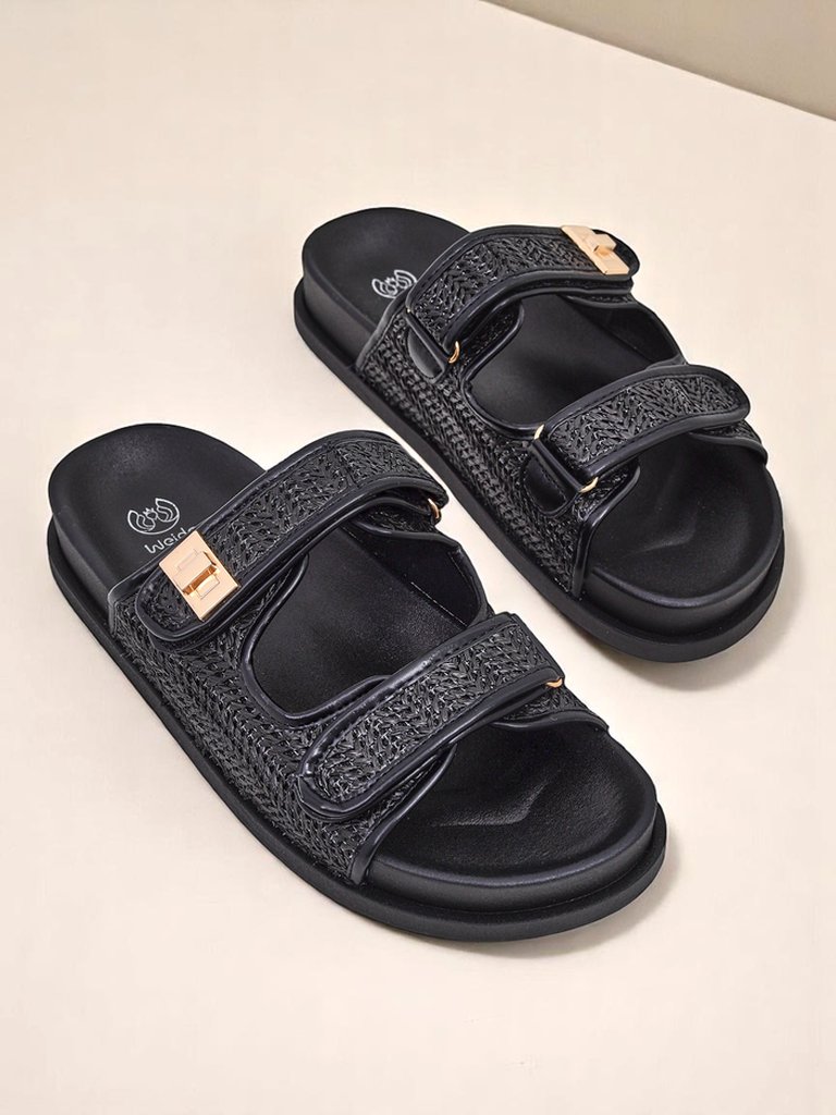 • Ilusad naiste suvised sandaalid, mis on valmistatud õlekangast ja kaunistatud plastpannaldega. Kummitald. Mudelil on reguleeritavad paeltekinnitusega rihmad. Need sobivad ideaalselt suviste rõivastega!
