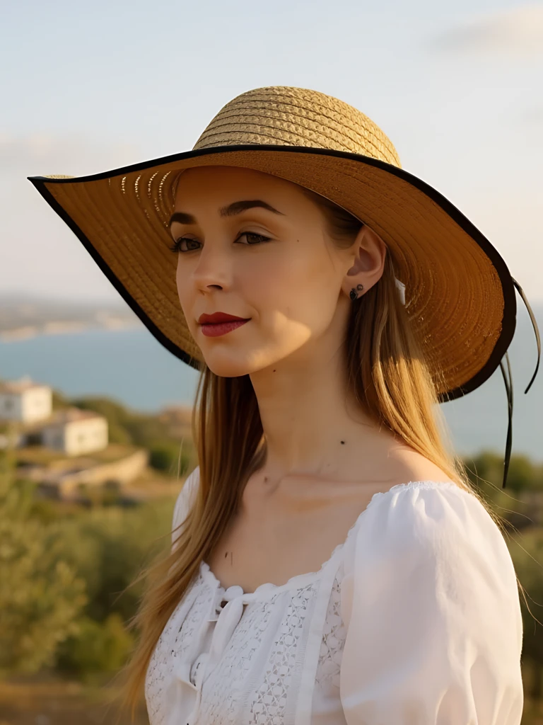 - Kerge õlgkübar laia äärega, kaunistatud õrna lipsuga. Ideaalne suveks, kaitseb päikese eest ja lisab stiili igale suvisele riietusele.