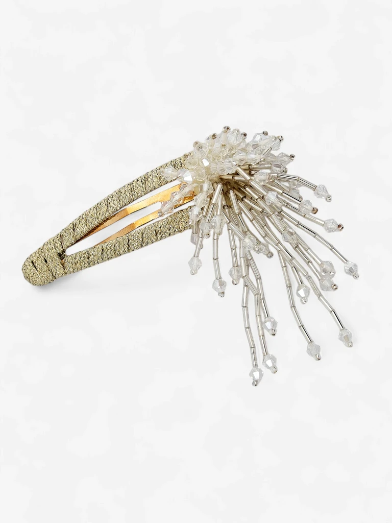 Aurelia Stella on eksklusiivne juuksenõel, mis on inspireeritud Itaalia elegantsist ja ikoonilisest käsitööst. Valmistatud kvaliteetsest metallisulamist, mis on kaetud tuhmumist takistava kihiga, ja pehmest bukleekangast, mis õrnalt valguses sädeleb. Kaunistatud käsitsi paigaldatud sünteetiliste kristallide ja klaashelmestega, mis loovad efektse kompositsiooni, mis meenutab tähesära. Toode ei sisalda niklit, mis teeb selle ohutuks tundlikule nahale ja ideaalseks pikemaks kandmiseks.Aurelia Stella juuksenõel on ainulaadne lisand igale stiilile. Selle ainulaadne muster ja sära muudavad selle ideaalseks valikuks nii pidulikeks sündmusteks kui ka igapäevasteks stiilideks, mis vajavad glamuurset aktsenti. Õrn, kuid vastupidav konstruktsioon tagab kindla hoidmise isegi paksudes juustes, ilma neid tõmbamata või ebamugavust tekitamata.Avastage kolm moekat stiilimisviisi:1. Õhtuseks väljasõiduks – kombineerige Aurelia Stella elegantse maksikleidi ja peente ehetega, et anda tervikule luksuslik iseloom.2. Kontorisse – sobitage klassikalise jakiga ja lihtsa soenguga, nt madala hobusesaba või sileda soenguga, lisades igapäevaellu veidi šikki.3. Igapäevaseks kandmiseks – kinnitage see lahtiste lainete või kerge palmiku külge, et rõhutada oma individuaalset stiili ja järgida uusimaid trende.Hooldus ja puhastamine: puhastage juuksenõela õrnalt niiske lapiga. Hoidke seda eraldi riidest kotis, et vältida kriimustusi ja sassi minemist teiste ehetega. Vältige kokkupuudet vee, parfüümide ja kemikaalidega, mis aitab säilitada selle sära kauem.Aurelia Stella peegeldab hooaja kuumaid trende: pärlid, kristallid ja taevast inspireeritud motiivid on praegu moelavadel ja moegurude seas valitsevad. See juuksenõel täiendab suurepäraselt iga stiili, ühendades endas modernsuse ja peene klassika.