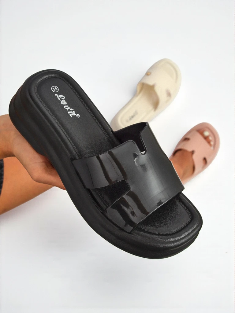 Naiste plätud paksema tallaga, ökoloogilisest nahast sisetalla ja lakitud kummist rihmaga. Moodne stiil ja mugavus ühes – ideaalne suviseks linnastiiliks.