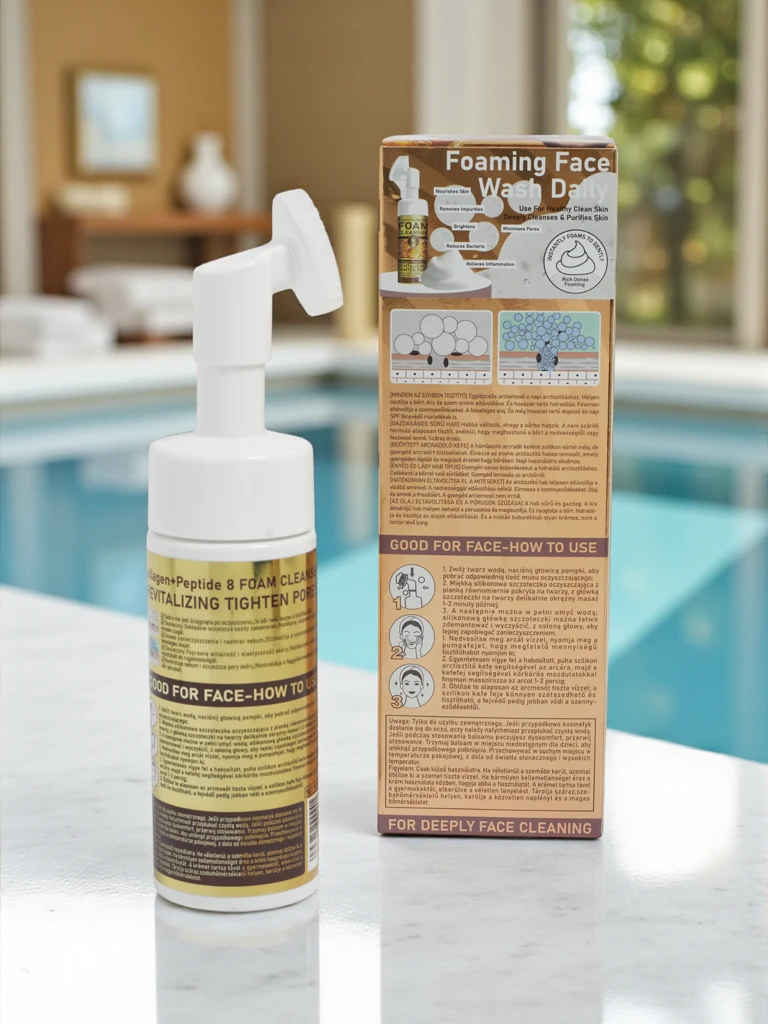 Õrn puhastav näopuhastusvaht eemaldab õrnalt mustuse ja meigi, toetades samal ajal naha elastsust tänu kollageenile ja peptiidile 8. Nahk muutub siledaks, pingul ja säravaks.