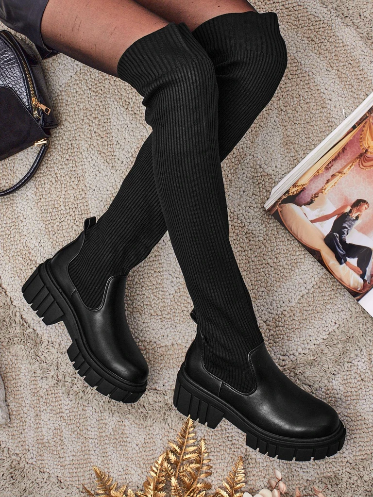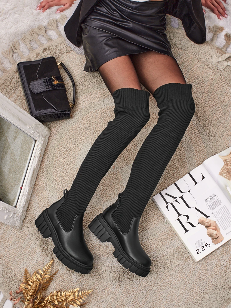 Stiilsed naiste poolsaapad üle põlve madala kontsaga. Pealmine on valmistatud elastsest kangasmaterjalist, millel on kunstnahast detailid, sees on kangast sisetald. Peale tõmmatav mudel. Ideaalne igapäevasteks sügisriietusteks!
