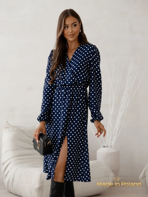 Calista Navy Polka Dot kleit on klassikaline ja ajatu pakkumine, mis toob garderoobi Itaalia šiki hõngu. Mudel on õmmeldud kvaliteetsest sertifitseeritud viskoosist – materjalist, mis on tuntud oma hingavuse, pehmuse ja kerge läike poolest. OEKO-TEX® viskoos tagab mugavuse nahale ja korraliku õhuringluse, vähendades allergiate riski. Tänu hoolikale õmblemisele ja kaasaegsele trükitehnoloogiale jäävad valged täpid intensiivseks ja vastupidavaks ka pärast korduvat pesemist.