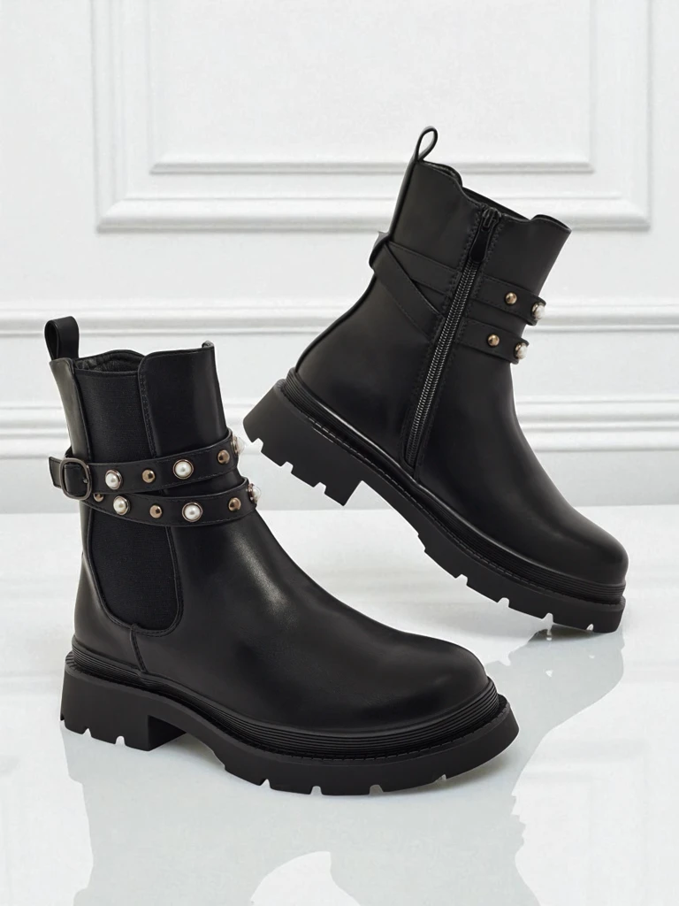 Materjal ja tehnoloogia: Poolsaapad on valmistatud kvaliteetsest ökonahast (PU) sileda, mati viimistlusega. Elastsed vahetükid külgedel (Chelsea tüüp) tagavad lihtsa jalgapaneku ja sisemine tõmblukk hõlbustab kohandamist. Kergest ja vastupidavast TPR/EVA materjalist valmistatud sügava mustriga tald tagab hea haarduvuse. Dekoratiivsed elemendid on kunstpärlid, mis on kinnitatud vanutatud kulla efektiga metallneedidesse. Tootmine hõlmab täpset masinõmblust ja termilist liimimist, et tagada pealispinna ja talla vastupidav ühendus. Toode ei ole kosmeetikatoode – kirjeldamiseks puuduvad koostisosad. Eelised ja kasutuskogemus: Poolsaapad pakuvad stabiilset tuge tänu tugevale tallale ja madalale, mugavale 3 cm kontsale. Elastsed külgpaneelid suurendavad mugavust ja kohanduvad säärega ning pehme vooder parandab kandmismugavust isegi pikemate jalutuskäikude ajal. Pärlkaunistused lisavad naiselikku aktsenti, ühendades elegantsi massiivse talla sõjalise iseloomuga. Stiilikombinatsioonid – mix & match soovitused: - Vabaaja linnastiil: kitsad teksad, ülemõõduline kampsun ja lühike mantel; poolsaapad kui kontrastne aktsent. - Rock / kontsert: nahktagi, võrgust minikleit või retuusid; pärlid lisavad stiili karmusele peent kontrasti. - Smart casual kontorisse: sigaretipüksid, pehmest materjalist särk ja pikk jakk; kingad rõhutavad riietuse iseloomu ilma elegantsi kaotamata. - Õhtune väljaminek: midikleit ja käekott – pärldetailid rõhutavad naiselikkust. Hooldus ja hoiustamine: Puhastada niiske lapi ja õrna ökonaha puhastusvahendiga. Vältida pikaajalist leotamist ja otsest kuumuseallikat. Immutamiseks kasutada sünteetiliste materjalide jaoks mõeldud spreid. Hoida kuivas kohas, täites paberiga, et säilitada kuju. Metallosade määrdumise korral puhastada pehme harjaga. Lisateave ja pakendi mõõdud: Kontsa kõrgus: 3 cm. Pakendi mõõdud: 31 x 11 x 24 cm. Kogukaal: 1364 g. Tootel on standardne müügijärgne teenindus – garantiitingimused on saadaval müüjalt. Trendid: Massiivse, funktsionaalse talla ja õrnade pärlite kombinatsioon sobib praeguse trendiga, mis ühendab utilitaarsed elemendid naiselike lisanditega. Chelsea tüüpi poolsaapad on endiselt moes hooajaline valik, samas kui dekoratiivsed detailid annavad neile ainulaadse iseloomu.