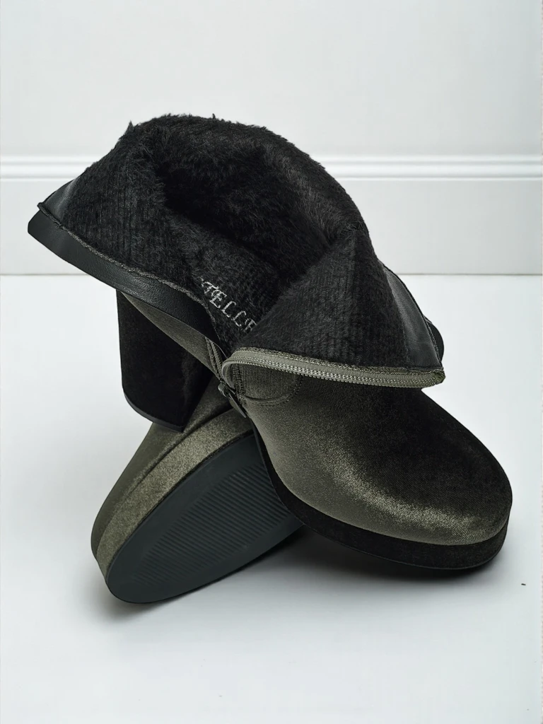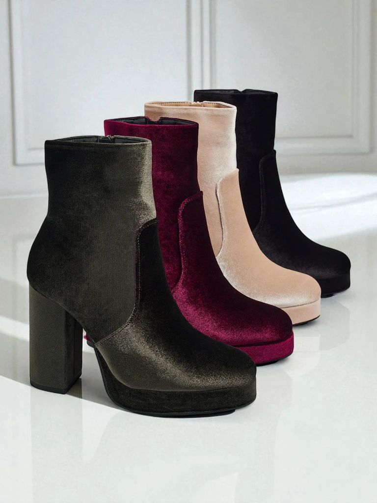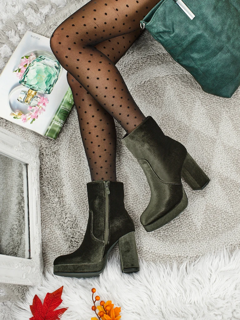 - Mugavad poolsaapad plokk-kontsaga, valmistatud a'la veluurkangast. Mudel kinnitatakse lukuga. Sees on õrn karvane vooder. Ideaalne valik sügiseks!