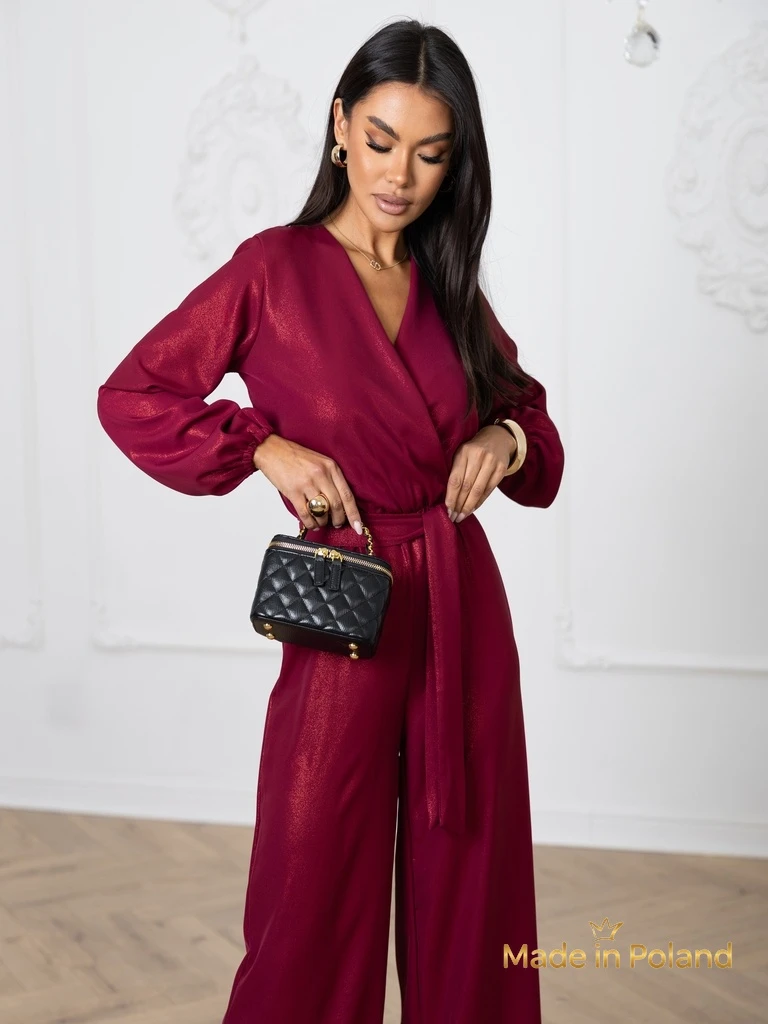 Naiste elegantne kombinesoon, mis on valmistatud meeldivast brokaatniidiga kangast. Ülaosa on ümbrikkinnise ja pikkade varrukatega. Laiad püksid elastse vöökohaga. Lisaks vöö. Ideaalne neile, kes hindavad mugavust.