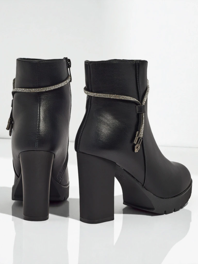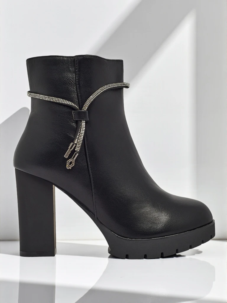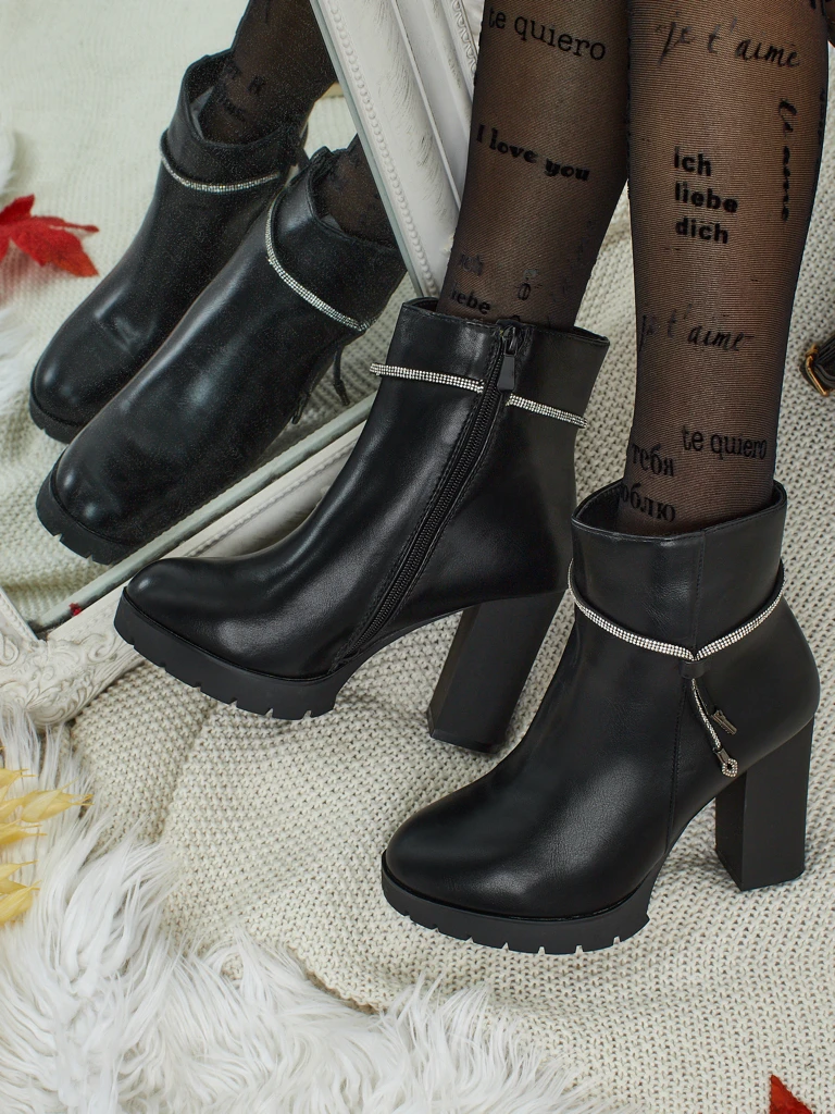 - Mugavad öko-nahast valmistatud jämeda kontsaga poolsaapad. Mudel kinnitatakse lukuga. Mudel on õrnalt karvase voodriga, sellel on dekoratiivne tsirkoonidega lukk. Ideaalne valik sügiseks!