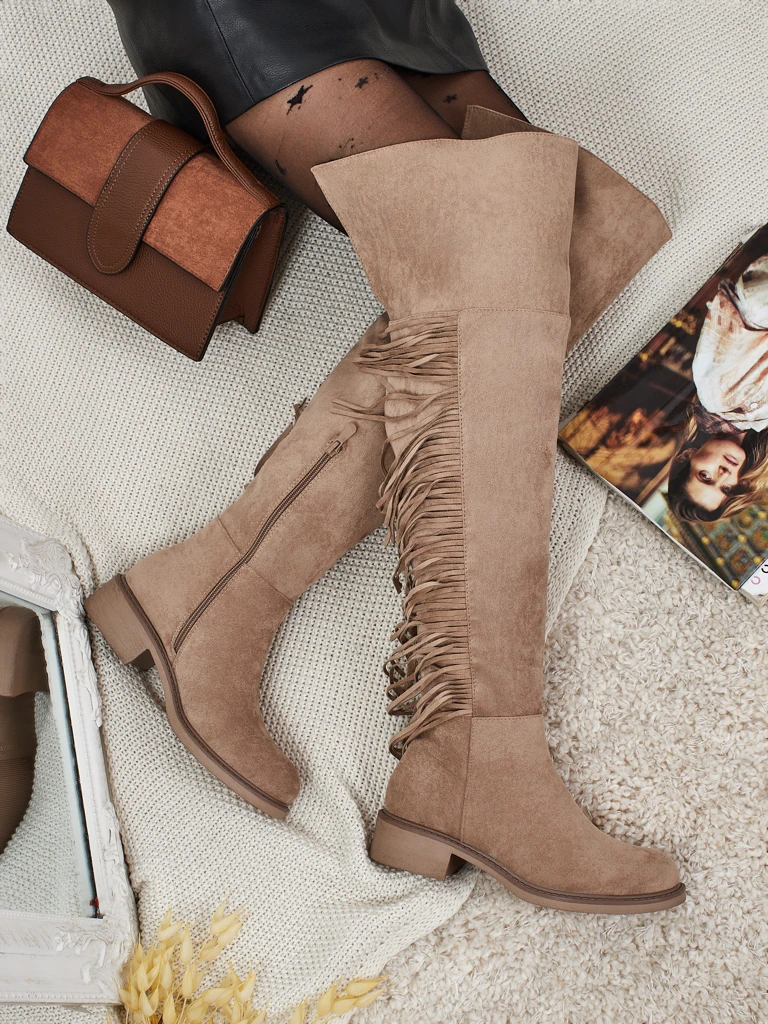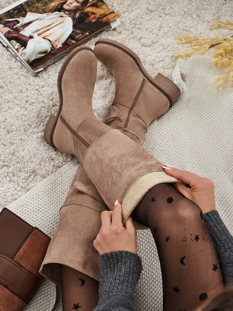 • Moodsad naiste madala kontsaga üle põlve saapad. Pealsed on valmistatud öko-seemisnahast. Sisemus on kaetud pehme karusnahaga. Mudel tagab mugavuse ja heaolu külmematel päevadel. Mudel on suletav poole sääreni ulatuva lukuga.