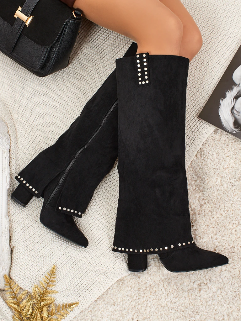 Kontsaga naistele kontsaga, terava ninaga, valmistatud ökoloogilisest seemisnahast ja täiendava, dekoratiivse needitud pealsetega. Saapad on lukuga, seest vooderdatud karusnahaga. Sobivad paljude naiselike stiilidega!
