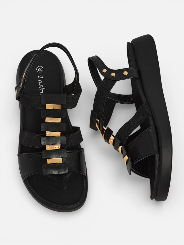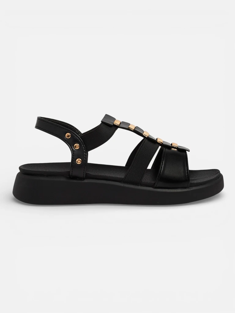 - Naiste rooma sandaalid, mis on valmistatud ökoloogilisest nahast ja kaunistatud kuldse aktsendiga. Stiilsed ja mugavad – ideaalsed suveks, naiselikeks stiilideks klassikalise aktsendiga.
