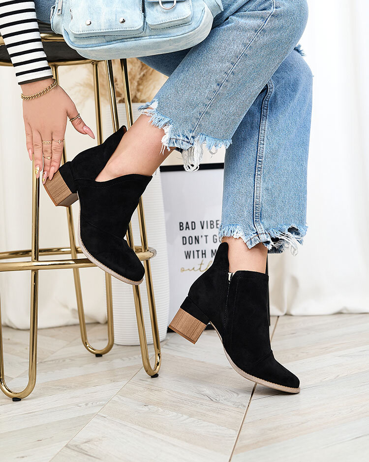 • Модные женские ботильоны с вырезами на невысокой стойке. Верх выполнен из эко-замши черного цвета, а стелька обтянута тканью. Модель застегивается на молнию с внутренней стороны. Прекрасно сочетается с любым повседневным стилем!