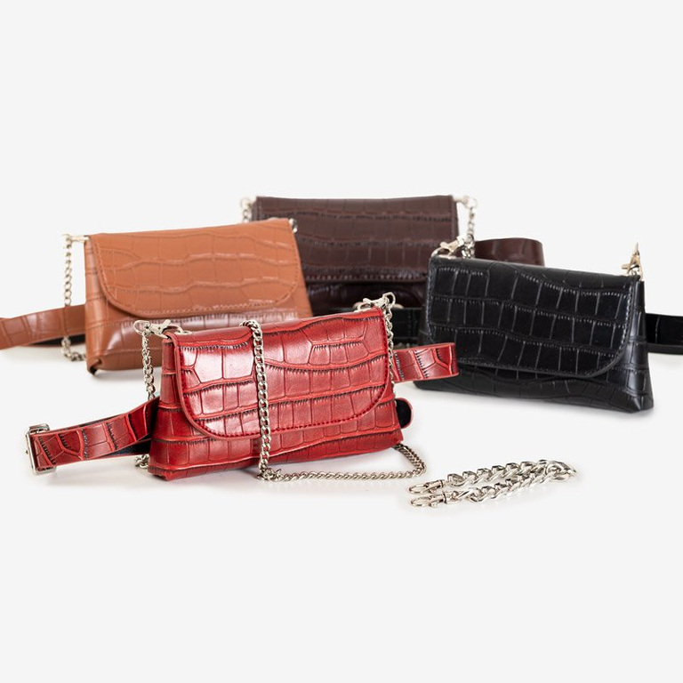 - Женская поясная сумочка на серебряной цепочке. Выполнена из эко-кожи и обработана под кожу змеи. Дополнительно имеет тонкую цепочку и регулируемый ремешок.