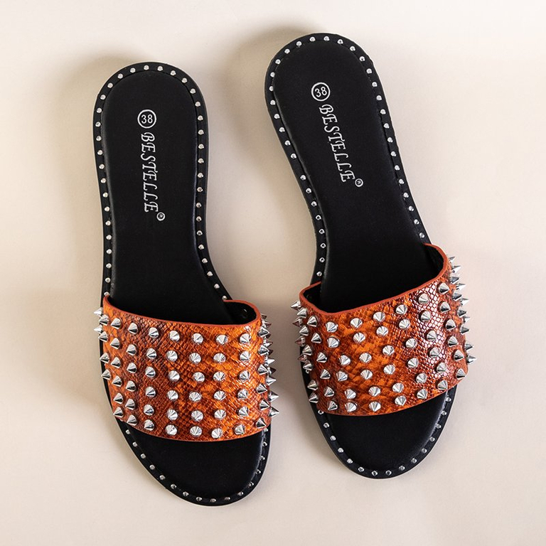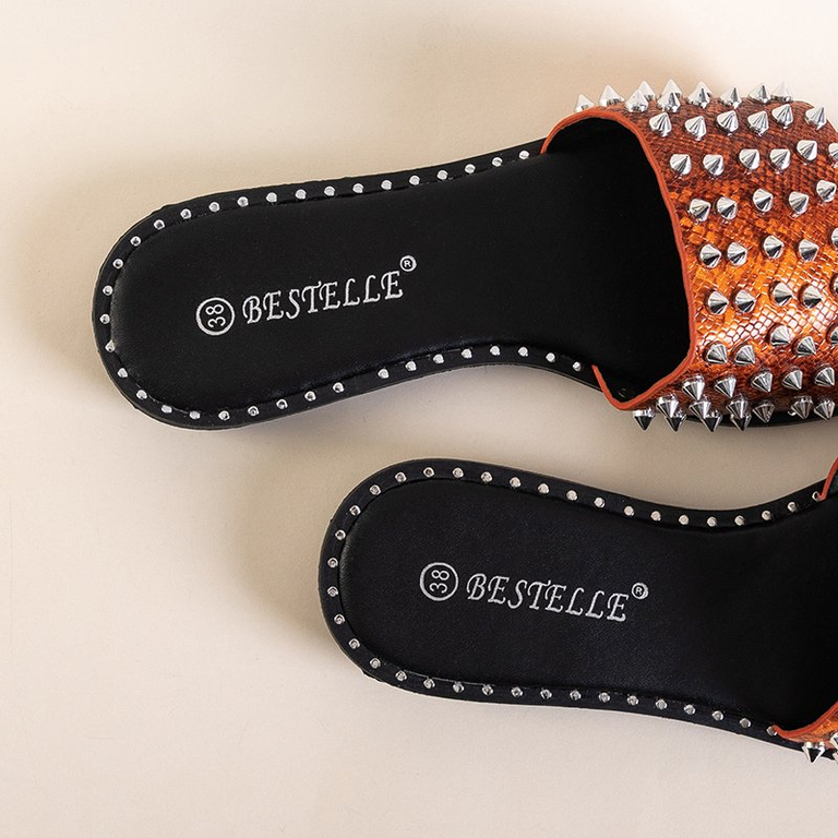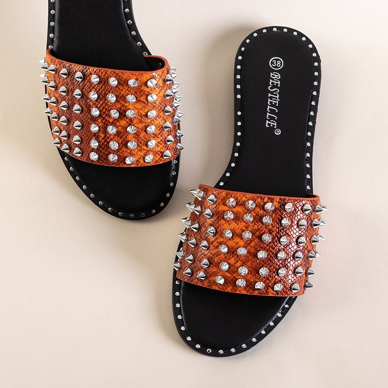 - Стильные женские шлепанцы на плоских каблуках. Верх изготовлен из экологической кожи, украшенной животным тиснением. Внутри стелька также из эко-кожи. Модель украшена шипами и заклепками. Идеально подходят для создания модных летних образов!