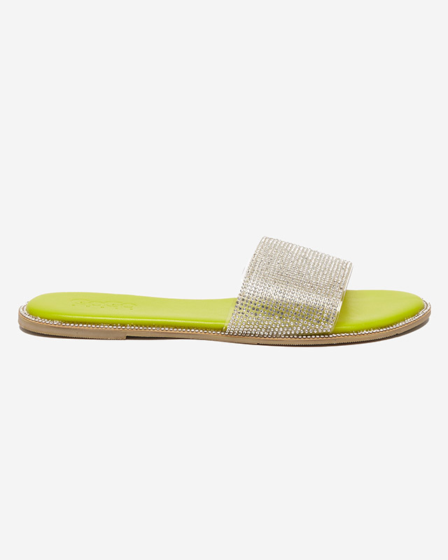 • Женские шлепанцы, украшенные стразами. Ремешок изготовлен из пластика, стелька - с экологической кожи.