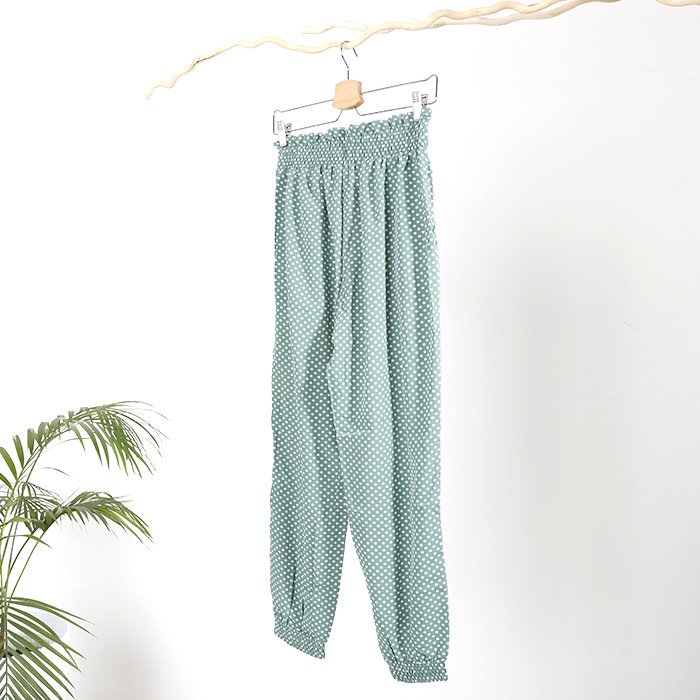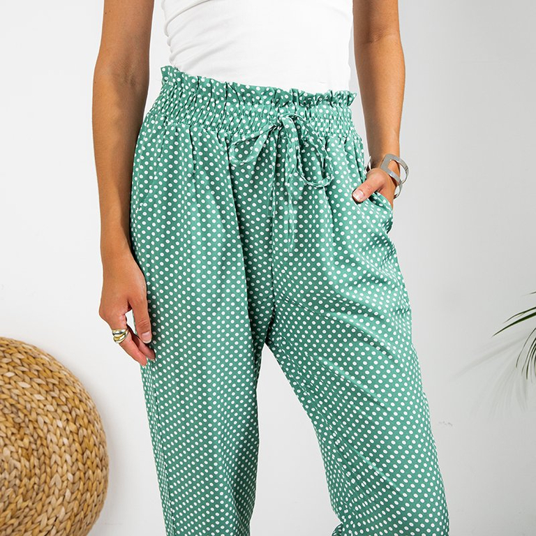 - Женские легкие брюки в горошек. Выполнены из ткани с высоким содержанием хлопка. Модель имеет эластичную резинку в поясе, декоративные завязки и 2 кармана.