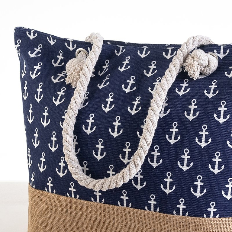 - Стильная женская пляжная сумка, изготовленная из текстильного материала и оснащена принтом в виде якорей. Модель с двумя толстыми ручками из прочной веревки. Внутри одно отделение без дополнительных карманов, застегивается на молнию.