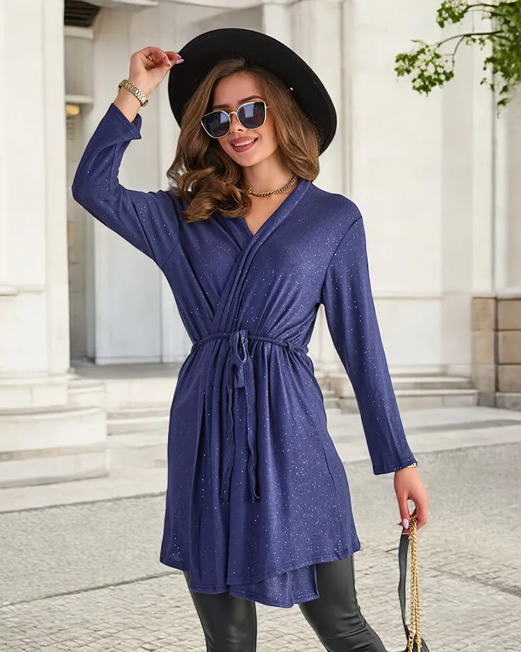 - Комфортный женский кардиган с мерцающим покрытием. Выполнен из вискозного материала. Свитер имеет пояс соответствующего цвета. Идеальная база для многих повседневных нарядов!