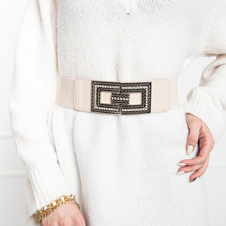 Бежевый женский ремень с серебряной пряжкой и стразами